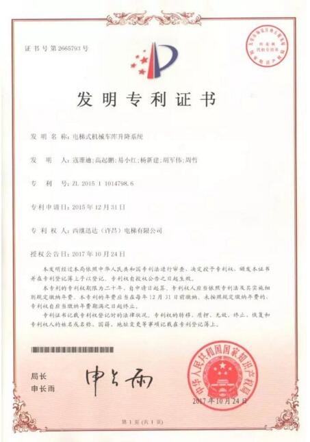 日前,西繼迅達一天喜獲了國家知識產權局頒發的兩項國家發明證書,專利名稱分別為“一種電梯通用型機械阻止裝置(ZL201510723959.2)”和“電梯式機械車庫升降系統(ZL201511014798.6)”