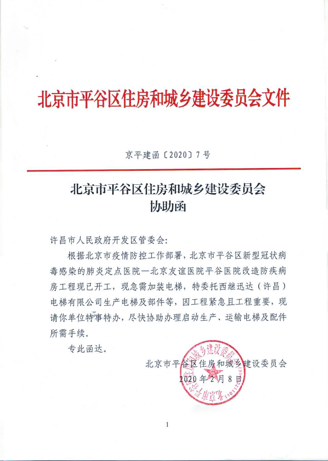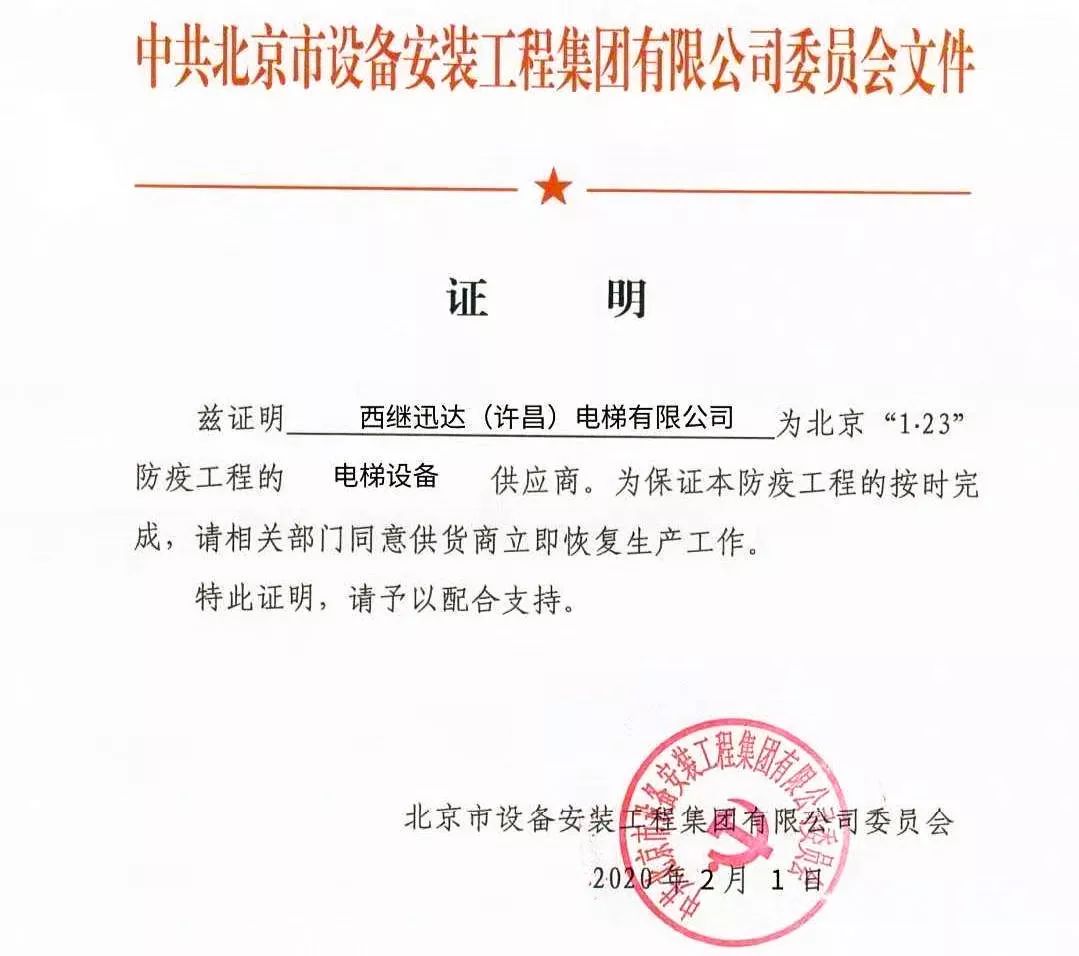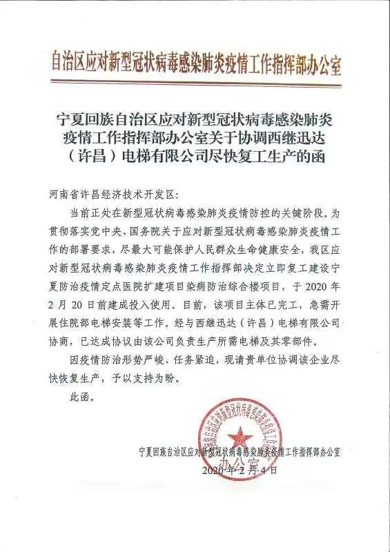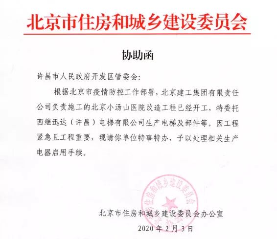 北京市住房和城鄉(xiāng)建設(shè)委員會(huì)給許昌市開發(fā)區(qū)管委會(huì)發(fā)來協(xié)助函,根據(jù)北京疫情防控工作部署,北京小湯山醫(yī)院改造工程已經(jīng)開工,委托西繼迅達(dá)生產(chǎn)電梯及部件。因工程緊急,特事特辦,予以提前復(fù)工。