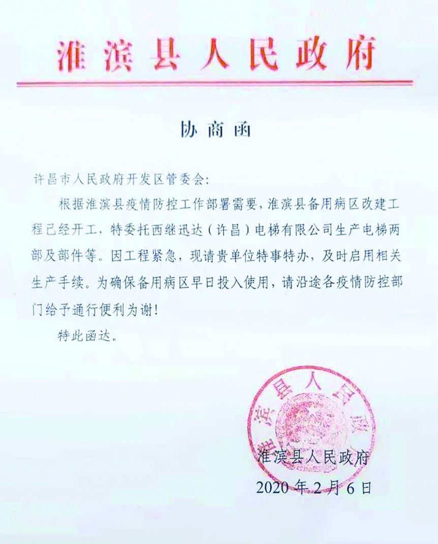 2月6日:淮濱縣人民政府發(fā)來函件,根據(jù)淮濱縣疫情防控工作部署需要,淮濱縣人民醫(yī)院康寧醫(yī)院急需開展改建工程電梯安裝工作,特委托西繼迅達(dá)盡快安排生產(chǎn)電梯及部件等。