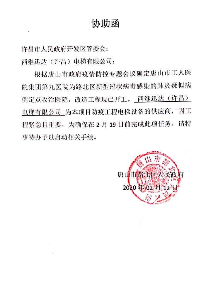 2月12日:唐山市路北區(qū)人民政府發(fā)來函件,為應(yīng)對(duì)疫情而確定的路北區(qū)疑似病例定點(diǎn)收治醫(yī)院,唐山市工人醫(yī)院集團(tuán)第九醫(yī)院急需開展改造工程電梯安裝工作,西繼迅達(dá)為該項(xiàng)目防疫工程電梯設(shè)備的供應(yīng)商,為確保項(xiàng)目建設(shè)進(jìn)度需要,希望西繼迅達(dá)盡快安排生產(chǎn)。